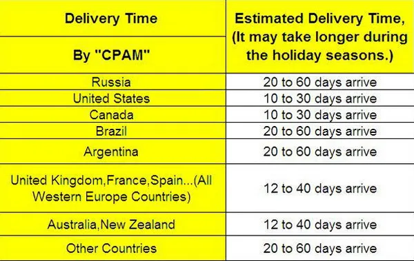 1. Мы делаем бесплатную доставку по Воздушной Почтой Столба Кита, для этого нужно около 15-45 рабочих дней, его зависит от назначения. если вы не получили посылку в течение 45 дней с момента отгрузки, пожалуйста, свяжитесь с нами, чтобы проверить, и мы продлим время для вас в первый раз.