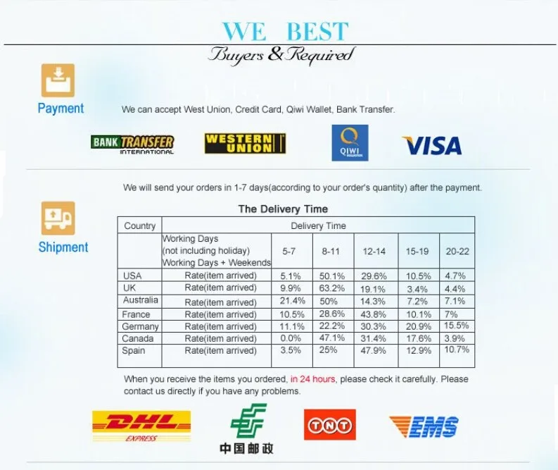 | доставка | EMS, UPS, DHL, столб воздуха кита, воздушная почта столба кита также поддержал к России, Турции, Brazil. ect |