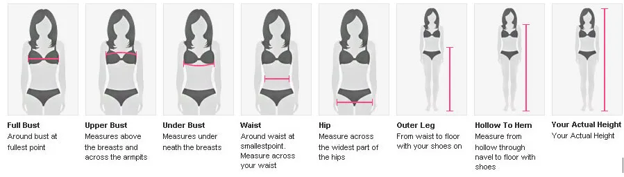 1. Пожалуйста, проверьте вашразмер бюста,Размер талии,бедра Размер,натуральные высотас нашими стандартного размера, и если вы не уверены вашего размера, вы можете связаться с Sonna! спасибо;
