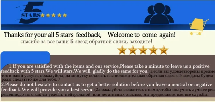 мы относимся к клиентам, как наши друзья. мы надеемся что наши продукты могут удовлетворить вас. мы пытаемся в наших силах, чтобы сделать вас счастливыми. пожалуйста, не забудьте оставить нас 5-звездочный обратной связи. если у вас возникли проблемы пожалуйста, свяжитесь со мной, прежде чем открыть спор или оставить отрицательную обратную связь, я буду решить все проблемы за вас стараться изо всех сил, надеюсь, что вы можете любезно понять делать бизнес тоже не легко, действительно спасибо.